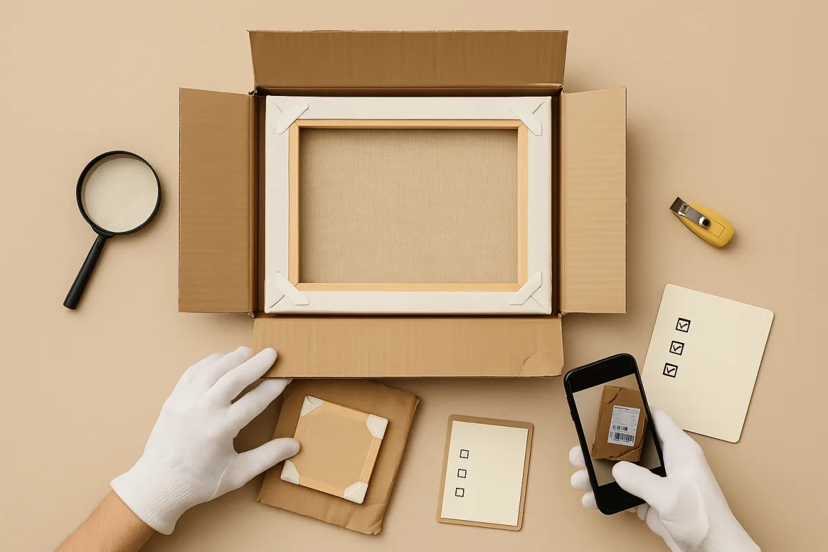 Für Maßleinwände, große Keilrahmen und Serien. Terminavis per Telefon/E-Mail, kantengeschützte Verpackung, auf Wunsch Tragehilfe, Zeitfenster oder Kisten-/Crate-Versand.